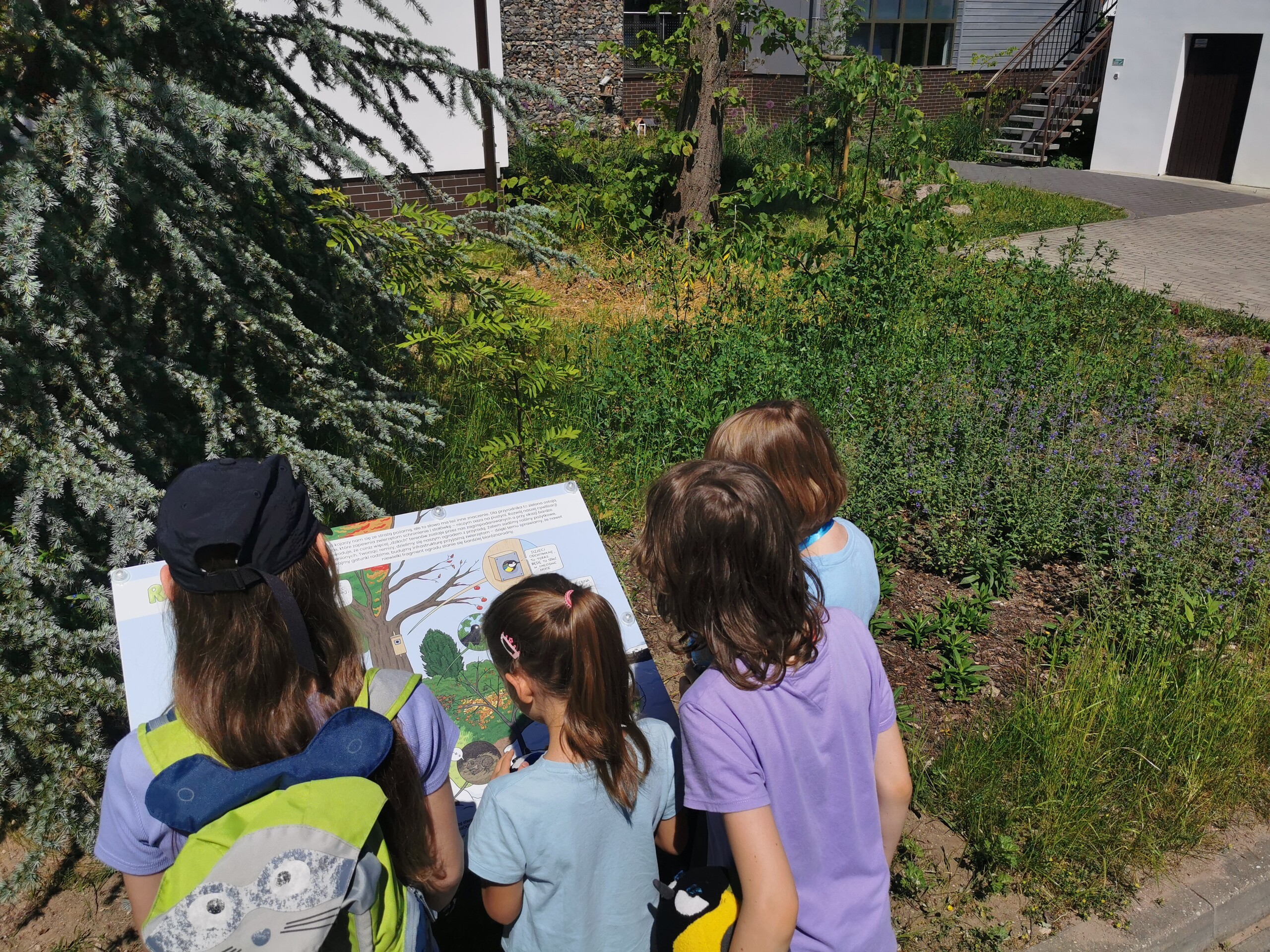 Czórka dzieci stoi przed tablicą edukacyjną w stylu komiksowym, w tle ogród i budynek